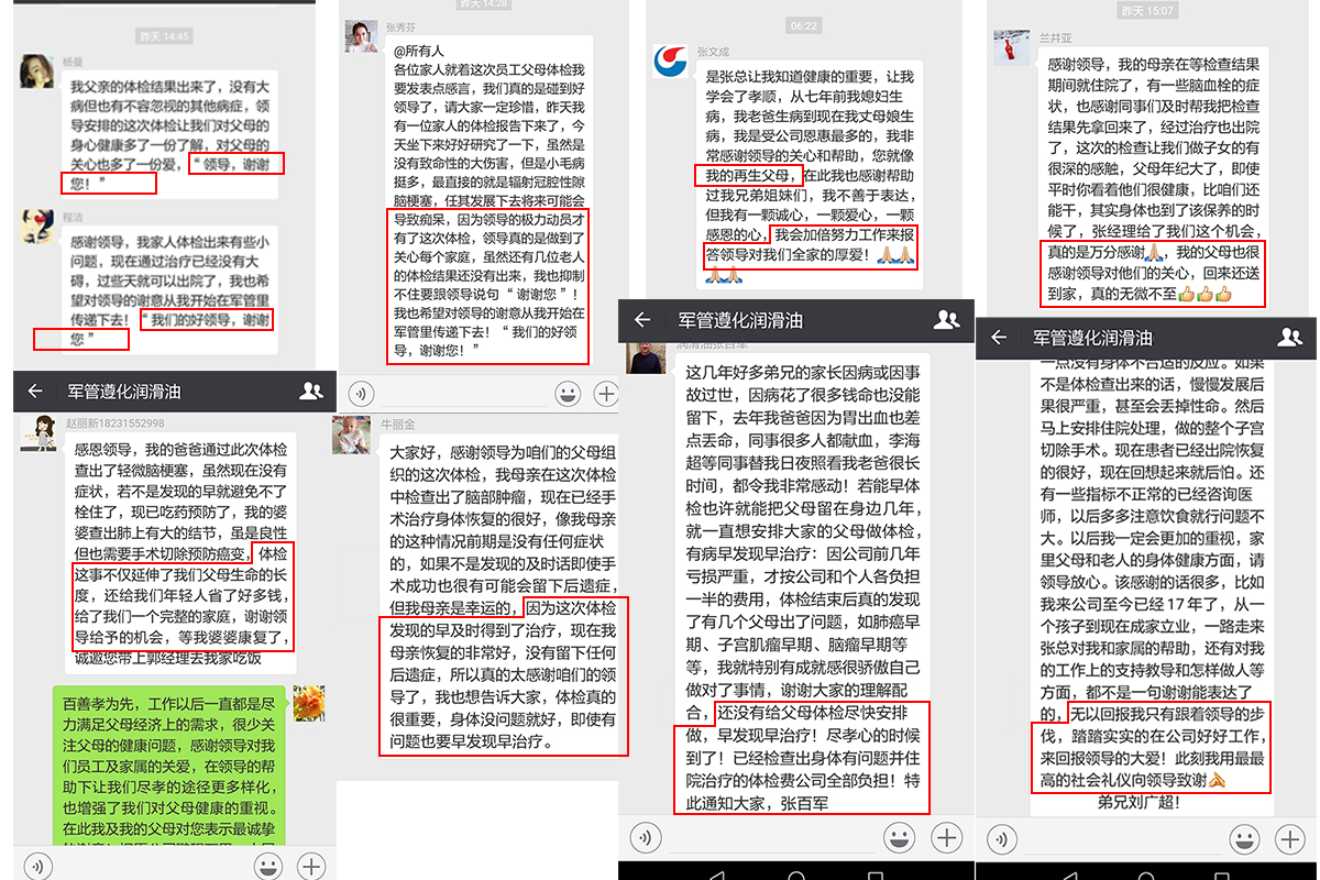 自從2018年相關(guān)數(shù)據(jù)顯示公司已經(jīng)扭轉(zhuǎn)連續(xù)多年虧損的狀態(tài),總經(jīng)理張百軍首先想到的事——公司員工的健康問題,于2018年3月組織全體員工體檢,對(duì)于體檢張百軍總經(jīng)理要求不能敷衍了事,要針對(duì)全體員工的情況,制定相應(yīng)的體檢項(xiàng)目,幾經(jīng)周折最終選定在唐山人民醫(yī)院體檢中心做體檢工作。萬萬沒有想到員工的健康問題只是張總關(guān)心的問題之一,隨后張總召開中層領(lǐng)導(dǎo)會(huì)議提出給員工父母體檢的想法,隨著時(shí)間的流逝,父母的年齡在不斷的增長(zhǎng),身體狀況也是每況愈下,但是他們對(duì)自我身體的健康意識(shí)卻非常的薄弱。于是接下來開始動(dòng)員全體員工勸說父母參加公司組織的體檢活動(dòng),又指定專人去各個(gè)醫(yī)院了解針對(duì)老年人的體檢項(xiàng)目,全體員工各司其職進(jìn)行著前期的籌備工作,于2018年8月完成了公司所有員工父母的體檢工作,所有員工父母對(duì)張總此次給予大家的福利深感謝意。其中更是多名員工的父母在這次體檢中受益匪淺,及時(shí)將病情扼殺在搖籃之中,為此多名員工表達(dá)了對(duì)張總的感謝。