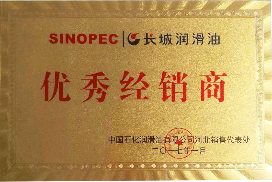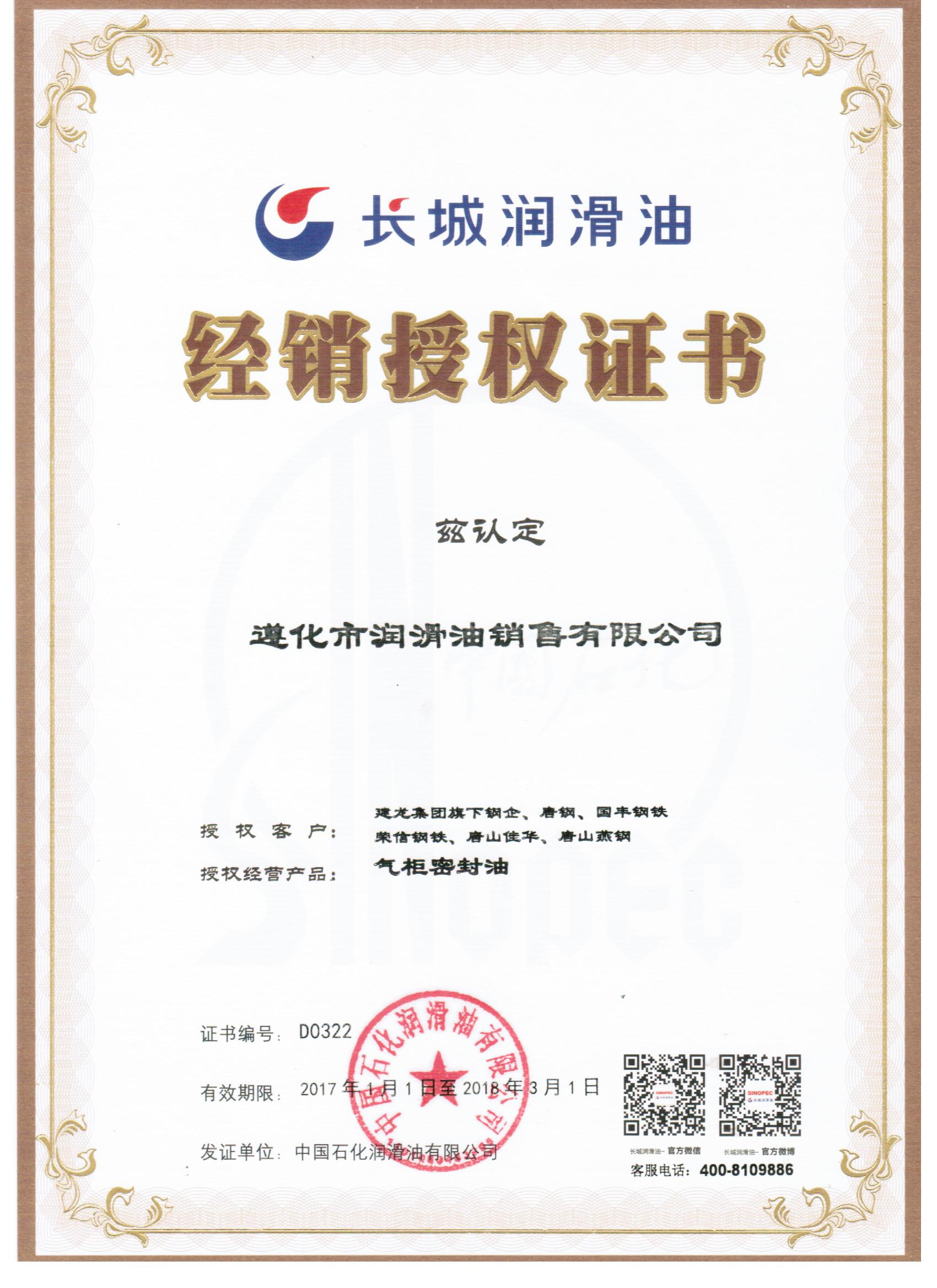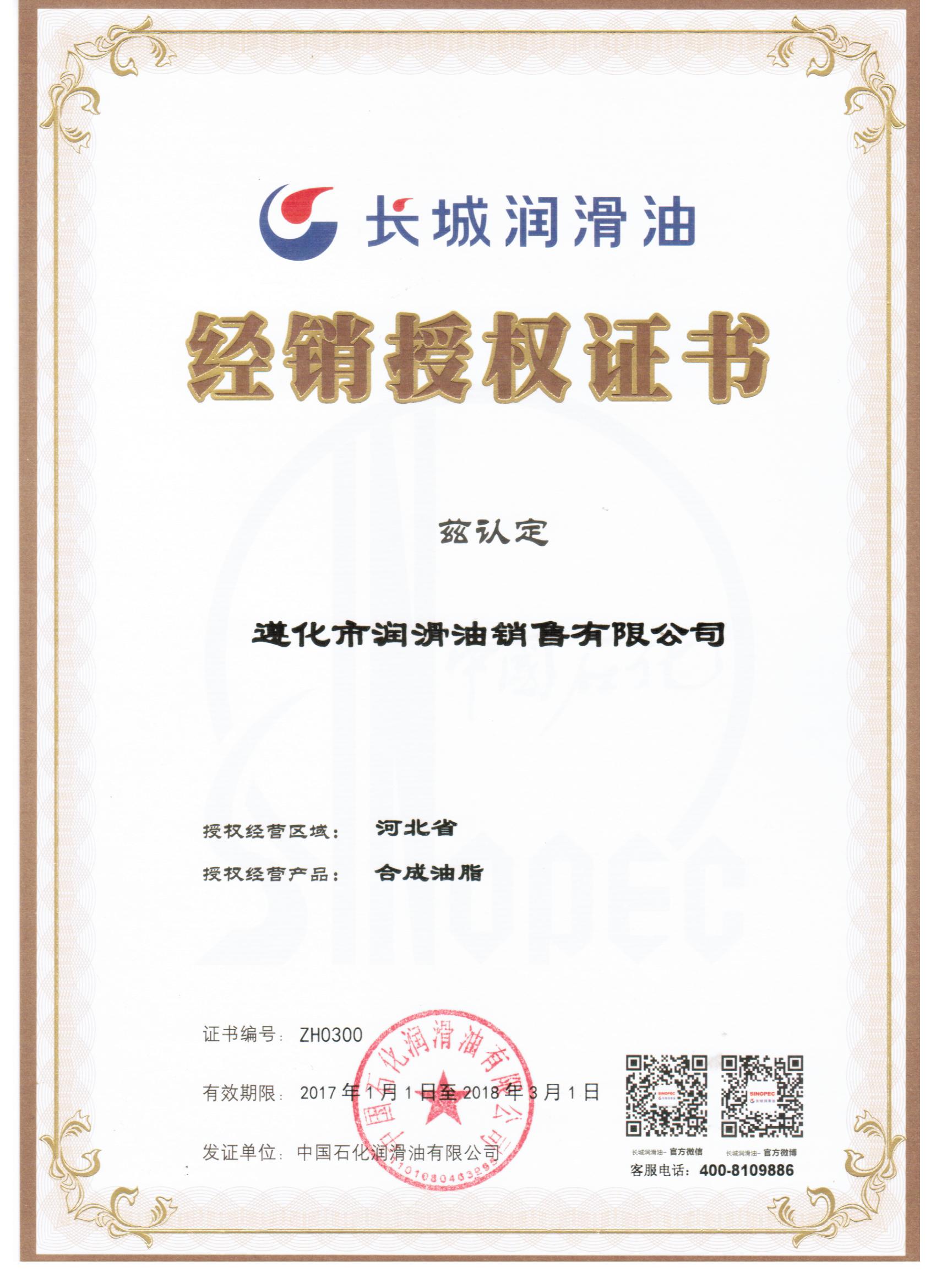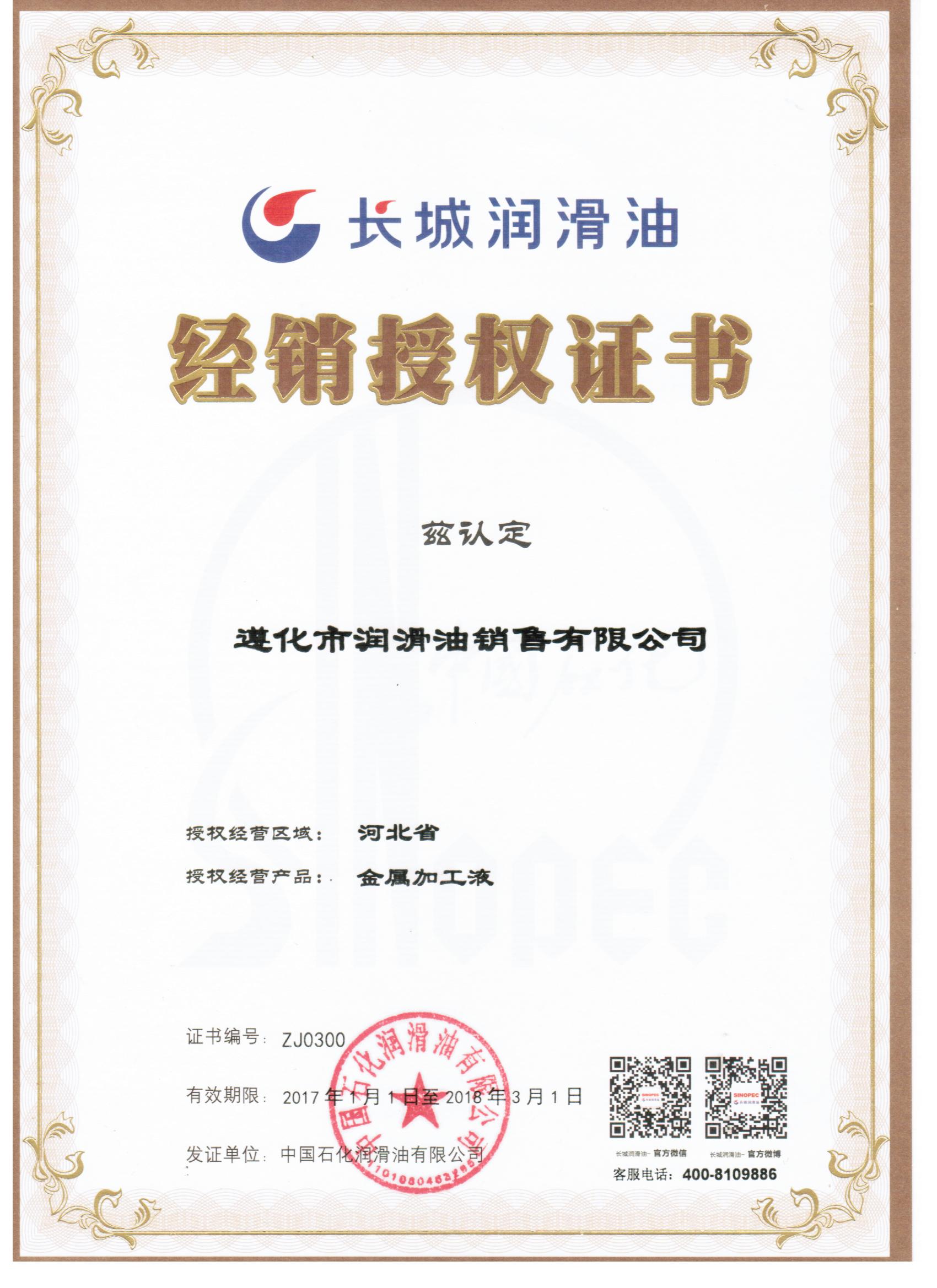 長城工業(yè)潤滑油授權(quán)證書