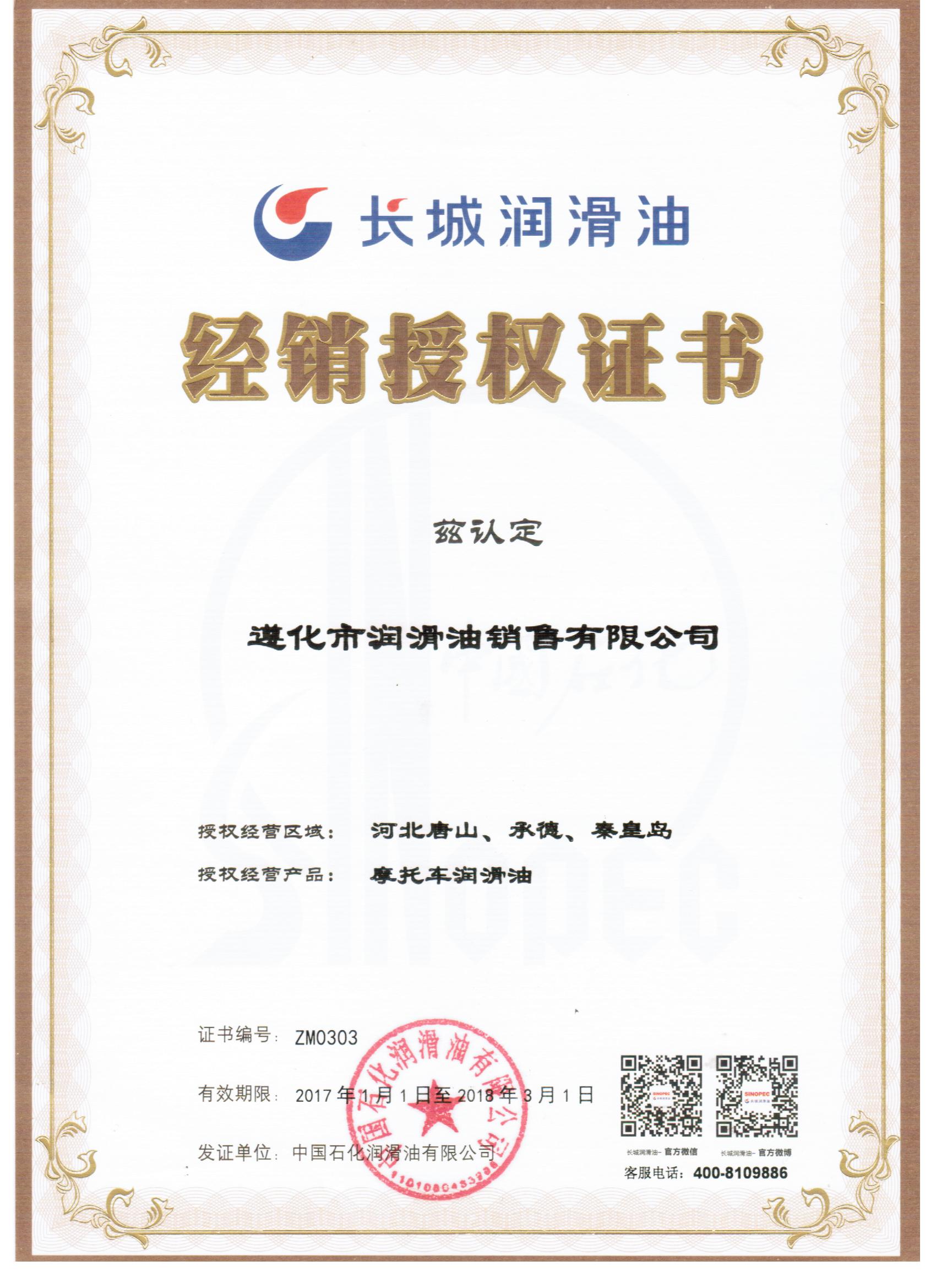長城摩托車油授權(quán)證書